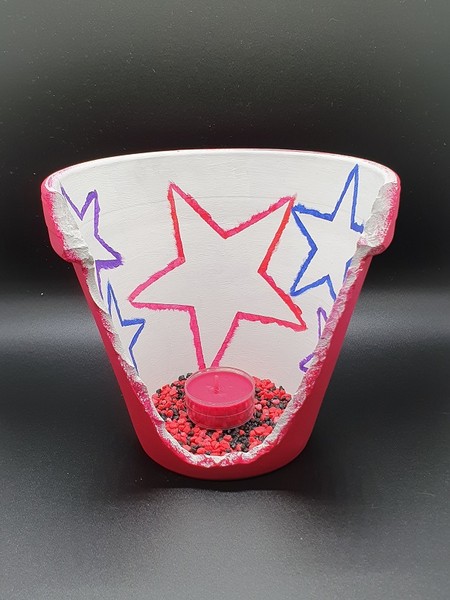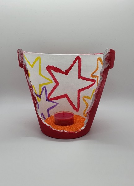 Handgefertigter Bruchtopf in rot, mit farbigen Sternen an der Innenseite, Höhe ca. 15cm. inkl. Teelicht und Dekosand