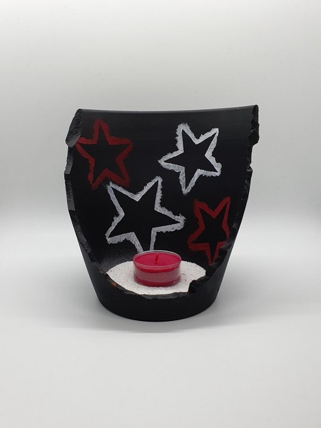 Handgefertigter Bruchtopf in schwarz, mit aufgemalten roten und weissen Sternen, Höhe ca. 15cm, inkl. Teelicht und Dekosand