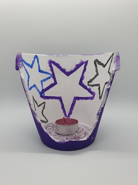 Handgefertigter Bruchtopf in violett, mit bunten Sternen an der Innenseite, Höhe ca. 15cm, inkl. Teelicht und Dekosand