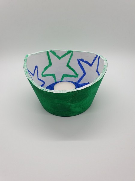 Handgefertigter Bruchtopf in grün, mit grünen und blauen Sternen an der Innenseite, Höhe ca. 7cm, inkl. Teelicht und Dekosand