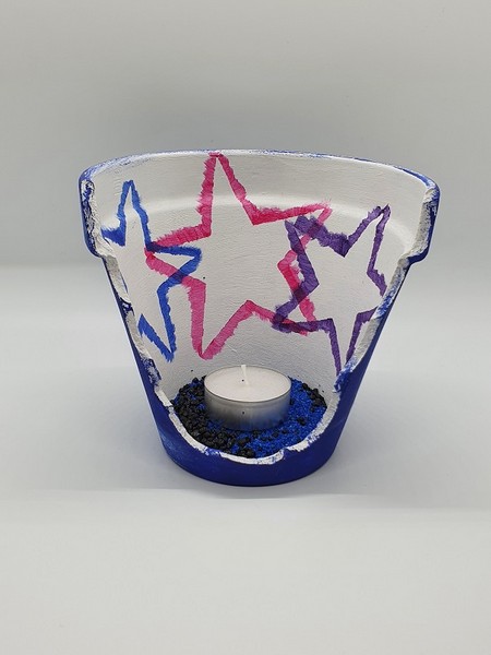 Handgefertigter Bruchtopf in dunkelblau, mit bunten Sternen an der Innenseite, Höhe ca. 11cm, inkl. Teelicht und Dekosand