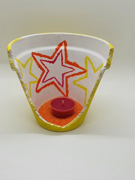 Handgefertigter Bruchtopf in gelb, mit Sternenmalerei in gelb/orange/rot an der Innenseite, Höhe ca. 12cm, inkl. Teelicht und Dekosand