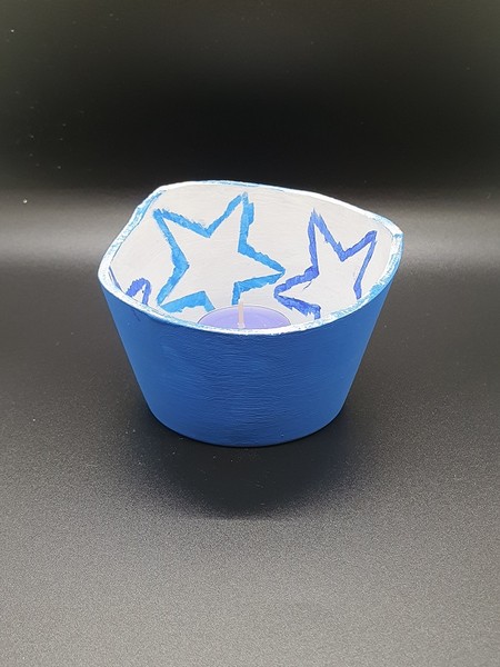 Handgefertigter Bruchtopf in hellblau, mit blauen Sternen an der Innenseite, Höhe ca. 7cm, inkl. Teelicht und Dekosteine