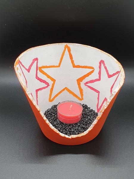 Handgefertigter Bruchtopf in orange, mit Sternen in orange und rot an der Innenseite Höhe ca. 11cm, inkl. Teelicht und Dekosand