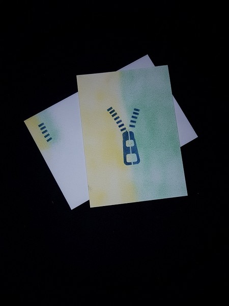 Reissverschlussmotiv blau auf grün-gelbem Hintergrund inkl. passendem Couvert, gefertigt mit Airbrushtechnik