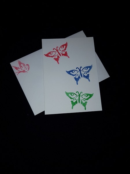 Schmetterlinge in rot, blau und grün inkl. passendem Couvert, gefertigt mit Airbrushtechnik