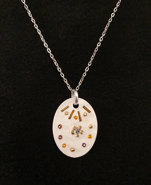 Halskettenanhänger aus Gips gegossen, max. Länge 4cm, max. Breite 3cm, Kettenlänge ca. 48cm