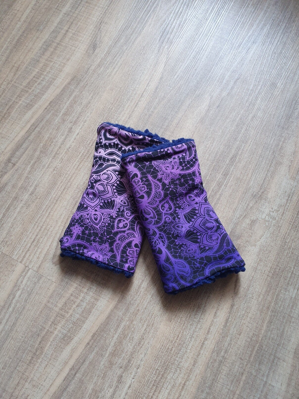 Kuschelige Armstulpen. Aussenstoff ist Jersey mit violettem Spitzenmuster, Innenstoff ist seidenfeiner Teddyplüshc in dunkelblau.