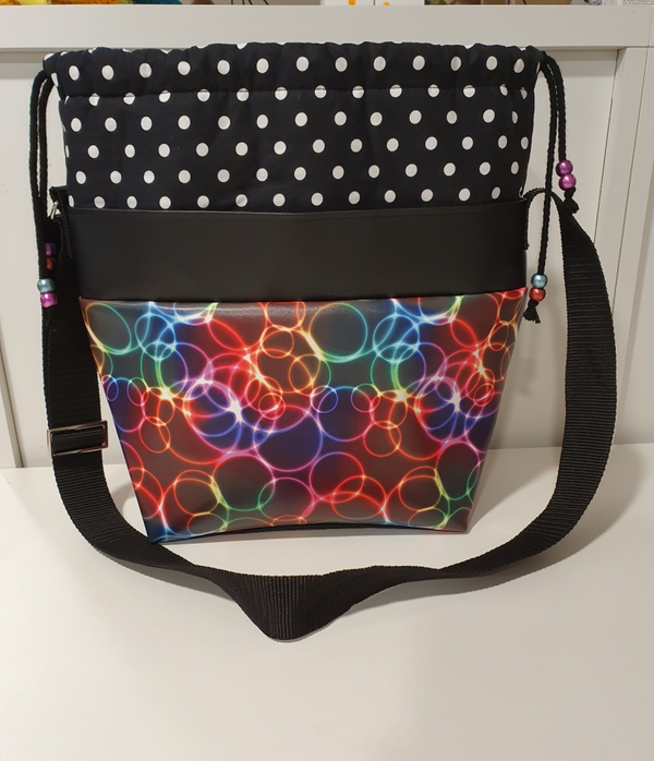 Diese aussergewöhnliche Handtasche besteht aus Kunstleder und 100% Baumwolle. Sie verfügt innen über ein geteiltes Einsteckfach, einen verstellbaren Tragegurt und wird durch die Kordel geschlossen.
