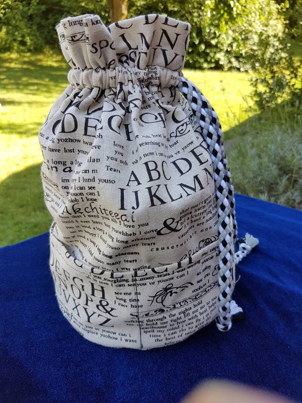 Ein Stoffbeutel mit verschieden grossen Aussentaschen rundherum und Tragekordel. Höhe 30cm, Durchmesser 21cm