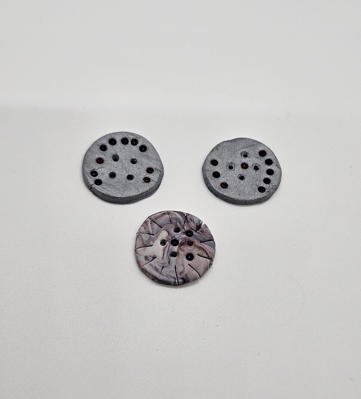 Dieses 3er Set handgemachte und mit Perlen verzierte Knöpfe aus Fimo sind Unikate. Sie können auch als dekorativer Eyecatcher auf Kleidung, Hüten oder Taschen angebracht werden. Durchmesser ca. 2.5cm