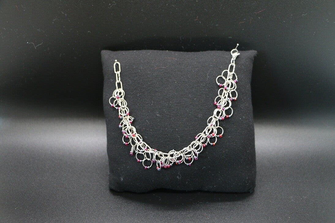 Diese Armkette ist so einzigartig wie Du! Sie besteht aus vielen kleinen Metallringen und Perlen in rot und silber.