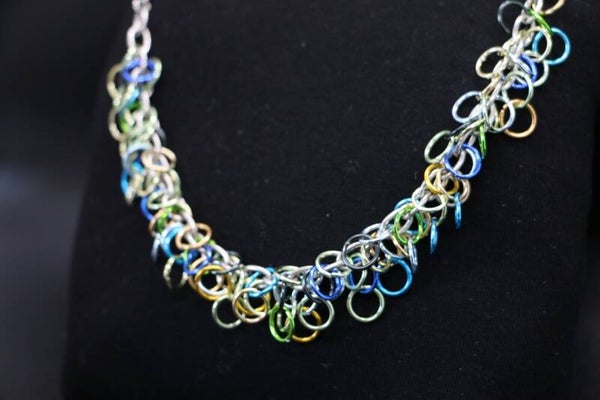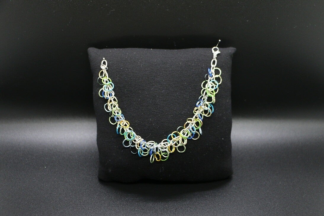 Diese einzigartige Armkette besteht aus vielen farbigen Metallringen in vorwiegend Blau- und Grüntönen. Maximale Länge: 20cm, kürzer kann sie in jeder Position getragen werden.