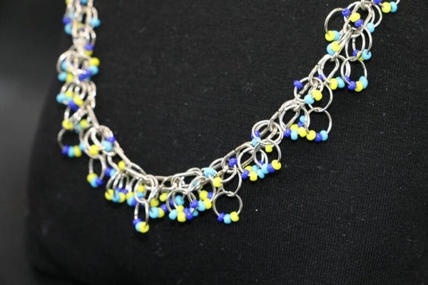 Diese einzigartige Armkette besteht aus vielen Metallringen und Perlen in Gelb und Blautönen. Maximale Länge: 20.5cm, kürzer kann sie in jeder Position getragen werden.