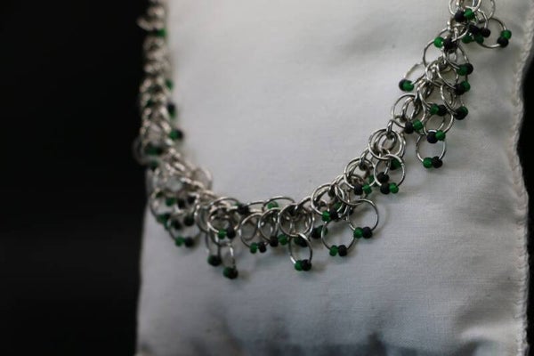 Diese einzigartige Armkette besteht aus vielen Metallringen und matten Perlen in grün und schwarz. Maximale Länge ca. 19.5cm, kürzer kann sie in jeder Position getragen werden.