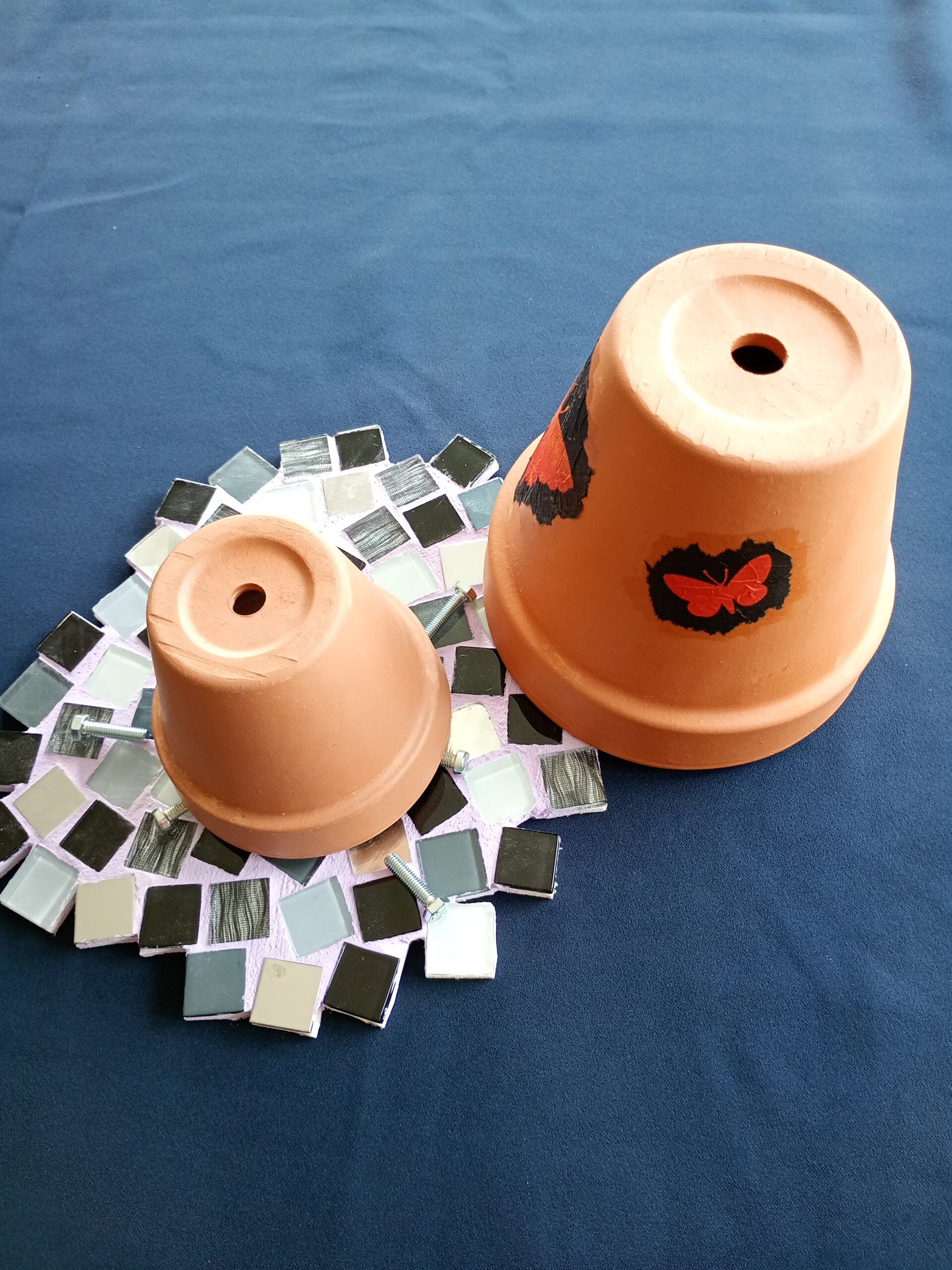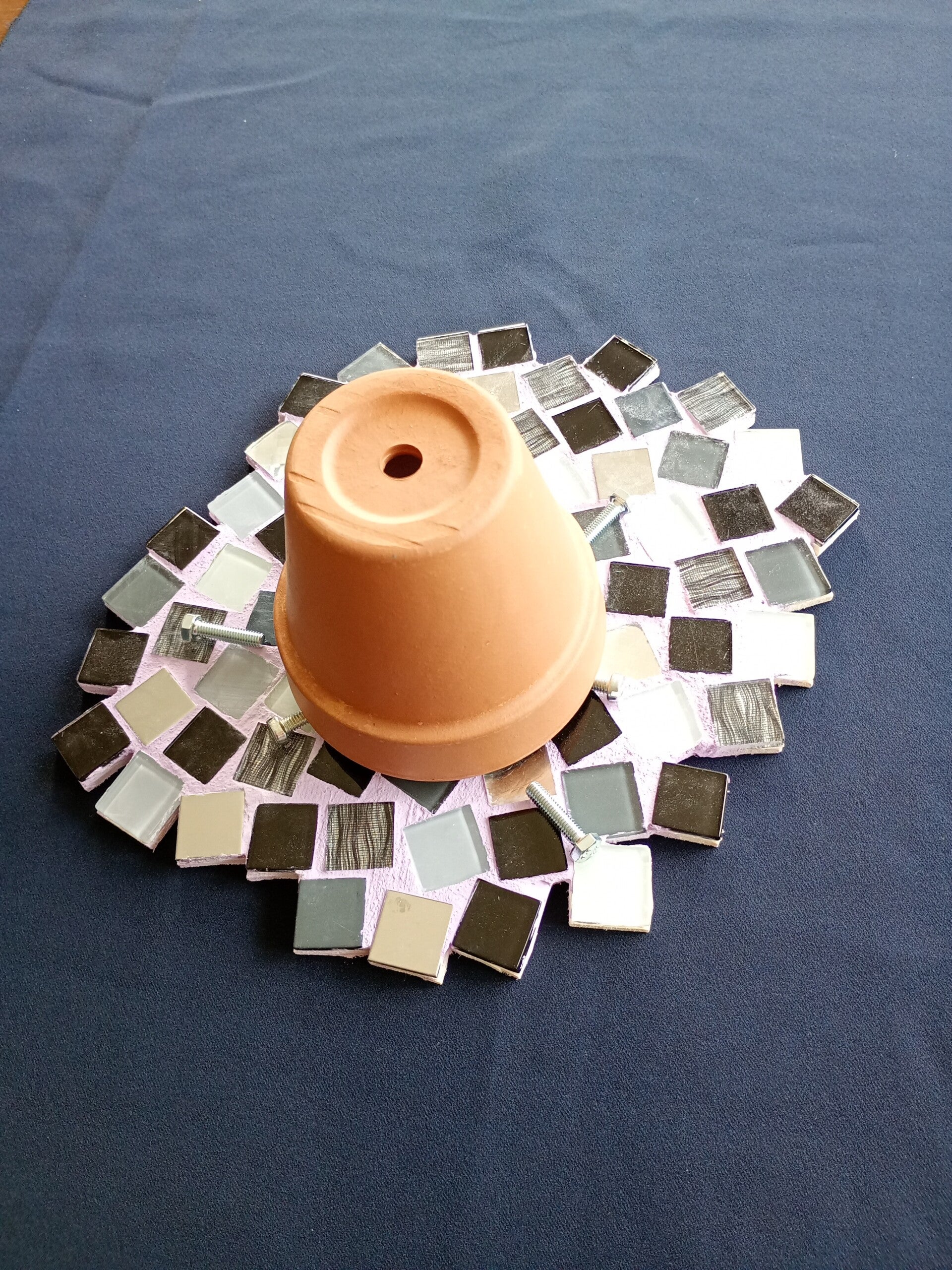Der Tisch-Topfofen eignet sich hervorragend um eine schöne Atmosphäre zu schaffen und Wärme zu verbreiten. Die beiden aufeinander gestellten Töpfe stehen auf einer Holzplatte, verziert mit Mosaiksteinen. Das Teelicht unter dem kleineren Topf führt rasch zu einer angenehmen Wärmestrahlung in unmittelbarer Nähe des Topfofens.