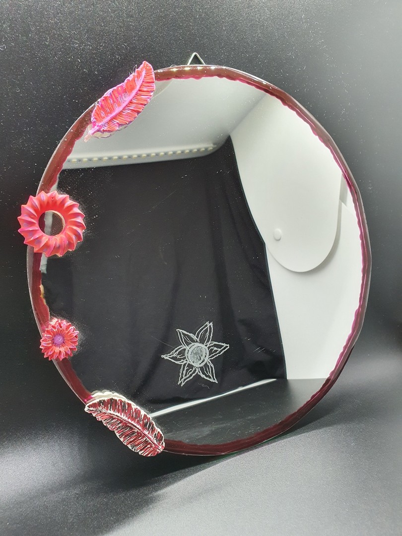 Spiegel mit 24cm Durchmesser, bemalt und mit Gips-Verzierungen in Rottönen